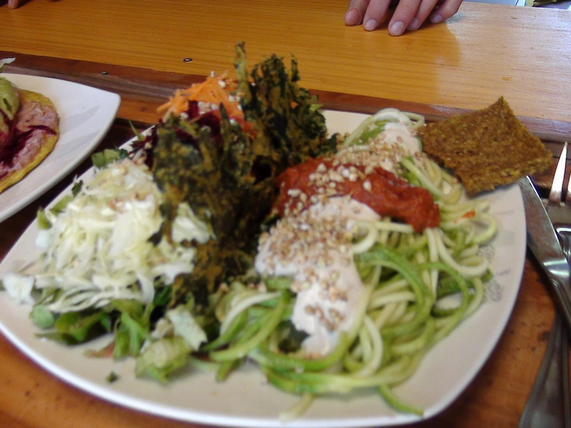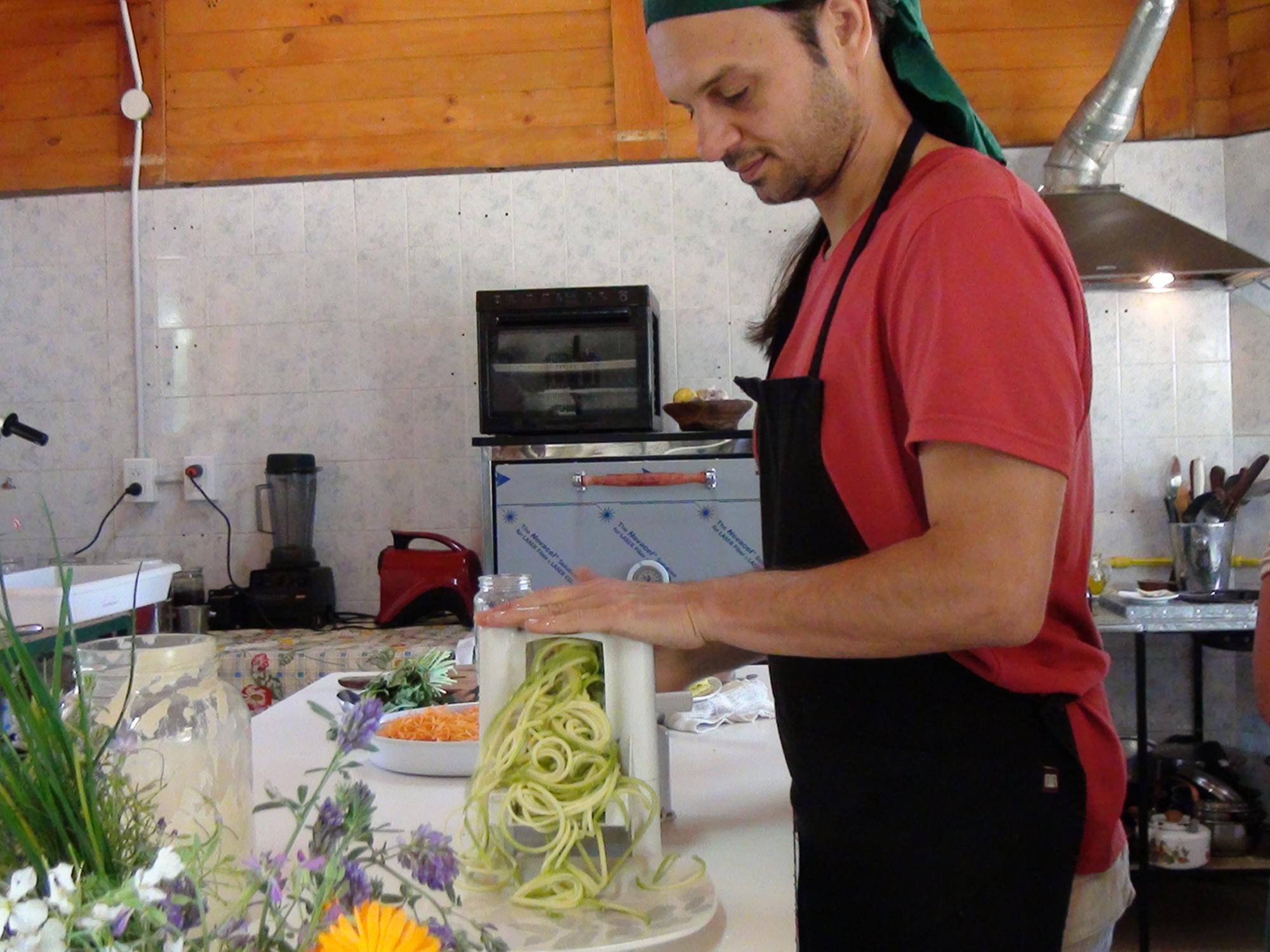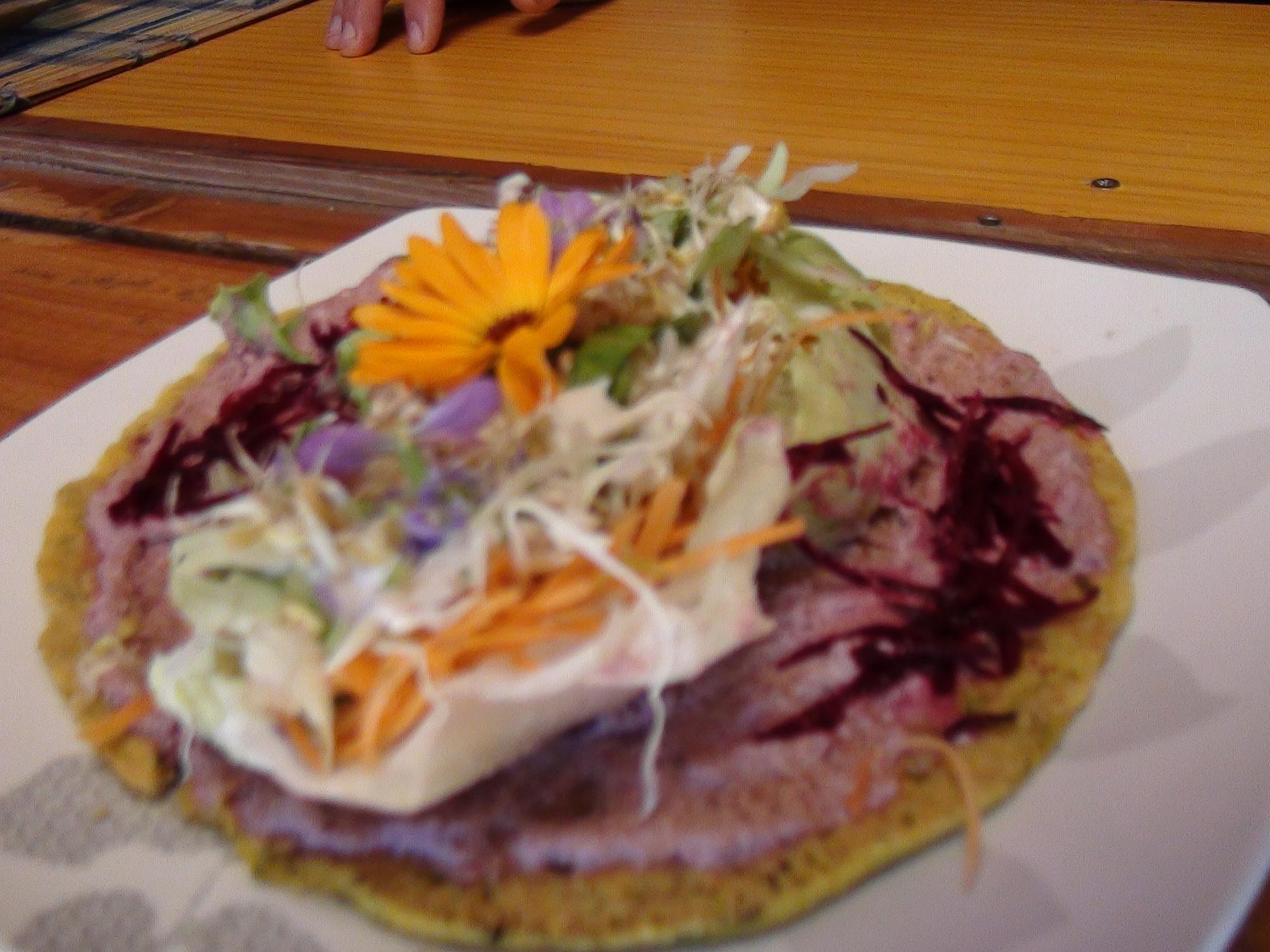 En contados minutos despliegan un enorme plato de tallarines vegetales, acompañado de ensaladas variadas, más un taco decorado con “flores que se comen” y colores que impactan y despiertan todos los sentidos: el sabor es riquísimo y dan ganas de volver a probar lo que saldrá mañana de las manos y mentes de los originales cocineros naturistas.