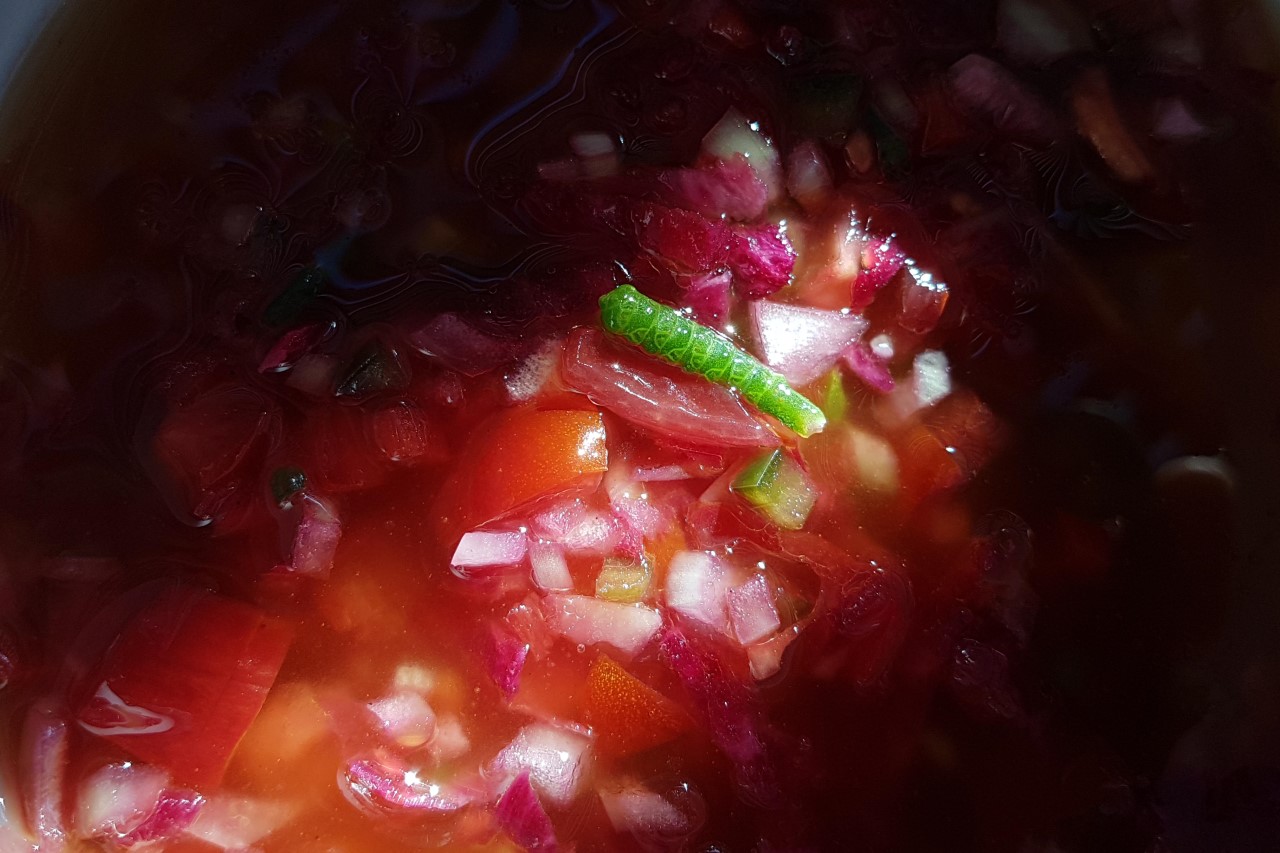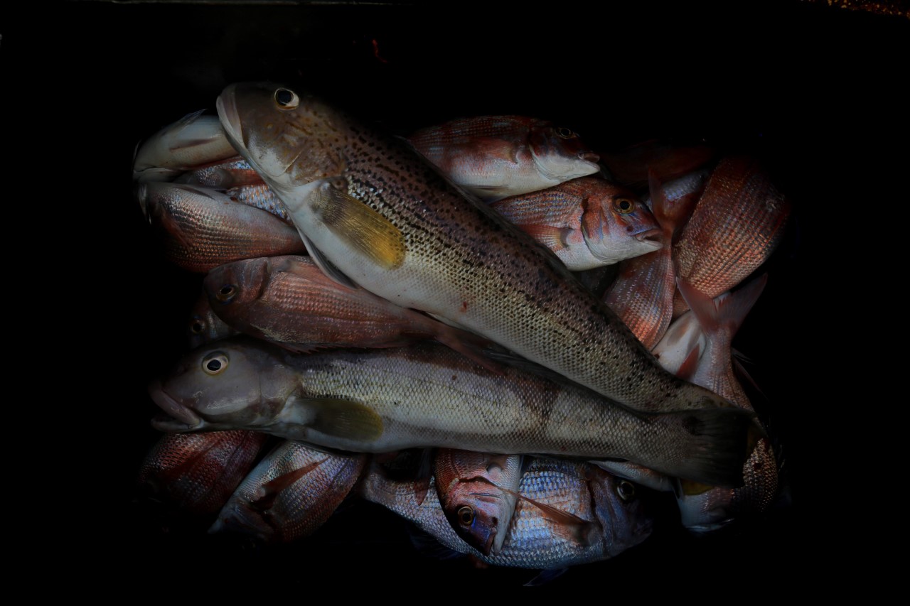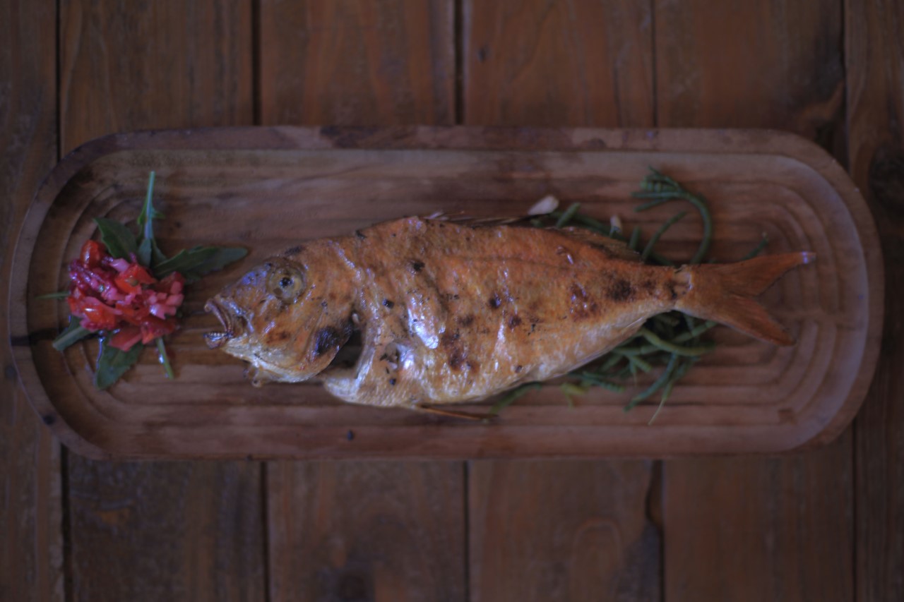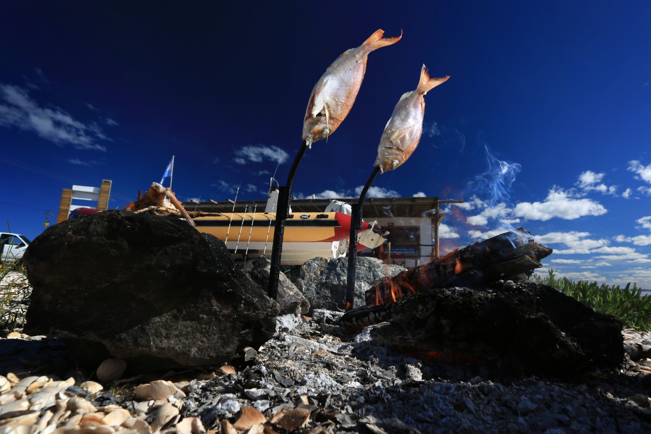 Una vez desembarcados hicimos un fuego en la playa donde clavaron unos pinchos para asar los besugos. Hecho a las llamas durante 15 minutos, más o menos, el pescado queda crocante… ni hablar de la piel que queda transformada en una cascarita tostada. Acá se come todo. Hasta la vinagreta que salsea la carne, hecha con dos cebollas cortadas en cuadraditos pequeños, un diente de ajo, un tomate casi triturado y una remolacha cruda rallada. Todo esto se mezcla con jugo de limón natural, aceite de oliva made in Las Grutas y pimienta. Más la salicornia, vedette de esta salsa.