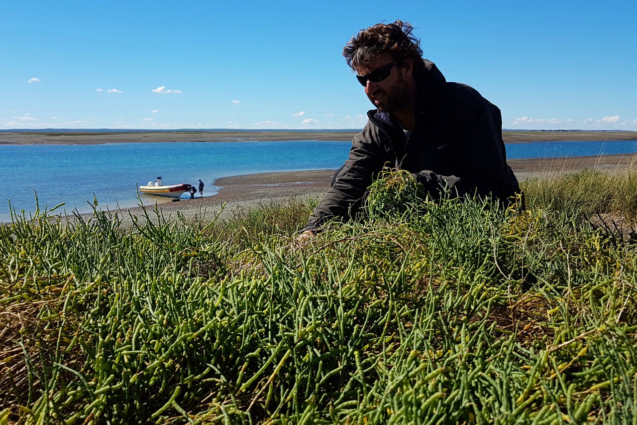 Ya era mediodía cuando Agustín decidió volver a la costa. Había que cocinar algunas de las piezas alcanzadas. En un momento desvió el rumbo hacia una playita donde juntó unas ramas de salicornia, que más tarde las pasaría unos minutitos por vapor para hacer una ensalada exquisita. Parecen pequeños arroces verdes jugosos que parecen explotar en la boca.