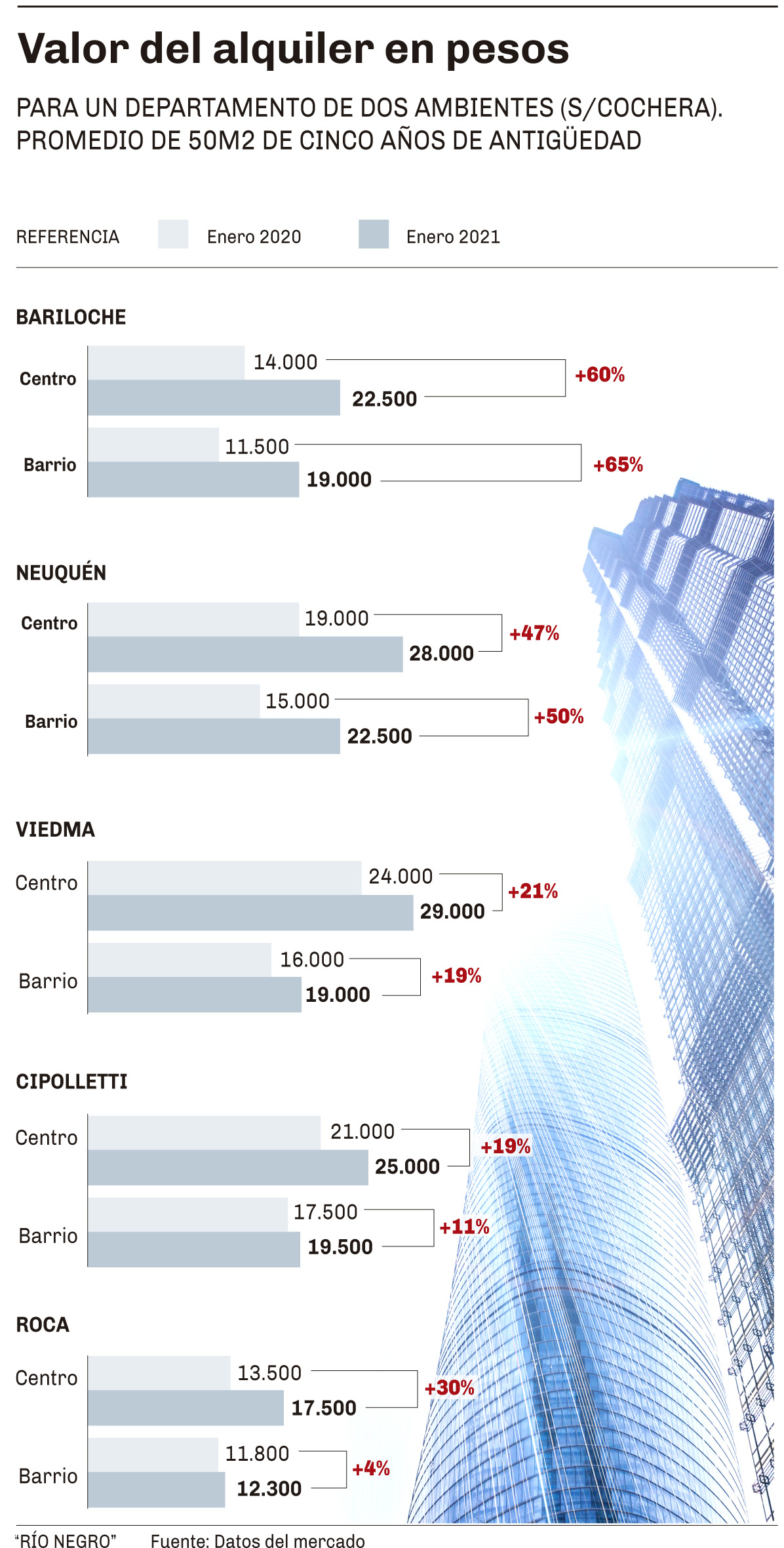 Bariloche y Neuquén lideran las subas relativas en estos últimos doce meses. Esto se da fundamentalmente por ser mercados muy dinámicos con alto grado de rotación. Los propietarios en este caso se cubrieron de la nueva Ley y las alzas saltaron hasta un 65% muy por encima de la inflación del año pasado que fue levemente superior al 38%.