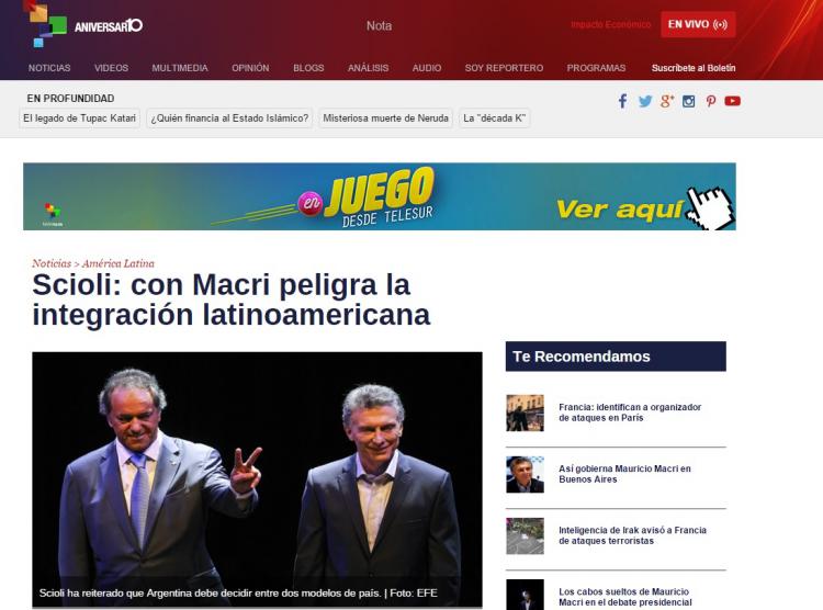 La cadena Telesur, por su parte, citó a Scioli cuando alertó que “las propuestas de Macri son peligrosas para Argentina en cuanto a políticas públicas e integración latinoamericana”.