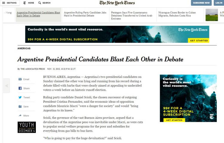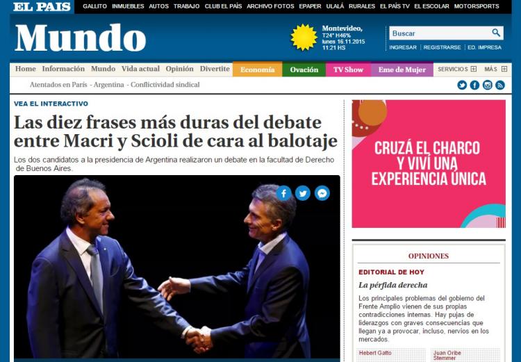 El diario español El País remarcó que fue “una noche única para la política argentina. Después de años de enfrentamiento del kirchnerismo con casi todos, Daniel Scioli y Mauricio Macri, dos amigos, pertenecientes al mismo grupo social, rompían una especie de maleficio y protagonizaban el primer debate presidencial de la democracia argentina”.