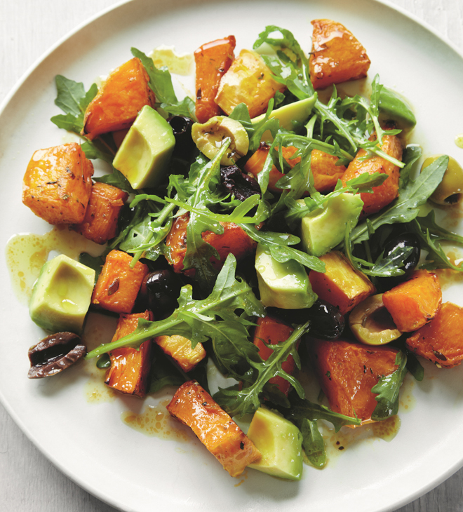 Precalentar el horno a 200 ºC, pelar la calabaza y cortarla en trozos pequeños. Después, se colocan las porciones en una bandeja aliñadas con aceite de oliva, sal y pimienta, además del pimentón y las hierbasaromáticas. Se mezcla bien y se hornea durante 40 minutos y se deja enfriar. Se deja enfriar y se prepara el aliño mezclando los ingredientes. Después se baña la rúcula en él, se añaden las aceitunas y el aguacate en dados y se incorporan a la calabaza.
