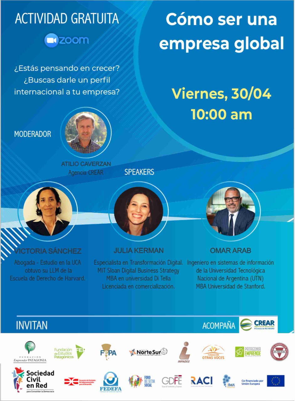 Este 30 de abril, a las 10, expondrán: Victoria Sánchez, Julia Kerman y Omar Arab. Sánchez abordará los aspectos legales más relevantes a la hora de iniciar actividades en otro país, Kerman dará consejos para una presentación eficaz ante potenciales inversores y en reuniones de negocios, y Arab compartirá su experiencia en emprendimientos tecnológicos y el escalamiento de empresas. El debate será moderado por Atilio Caverzan de la Agencia CREAR.