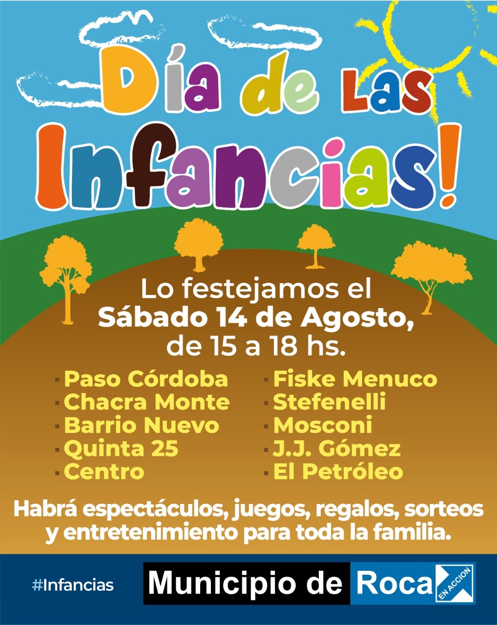 Por su parte, el Municipio de Roca invita a las familias a participar de los festejos del Día de las Infancias que se realizará Roca en forma descentralizada. De este modo, chicos y chicas de diferentes barrios de la ciudad podrán acercarse a la plaza más cercana a sus hogares y pasar un momento divertido junto a la comunidad.