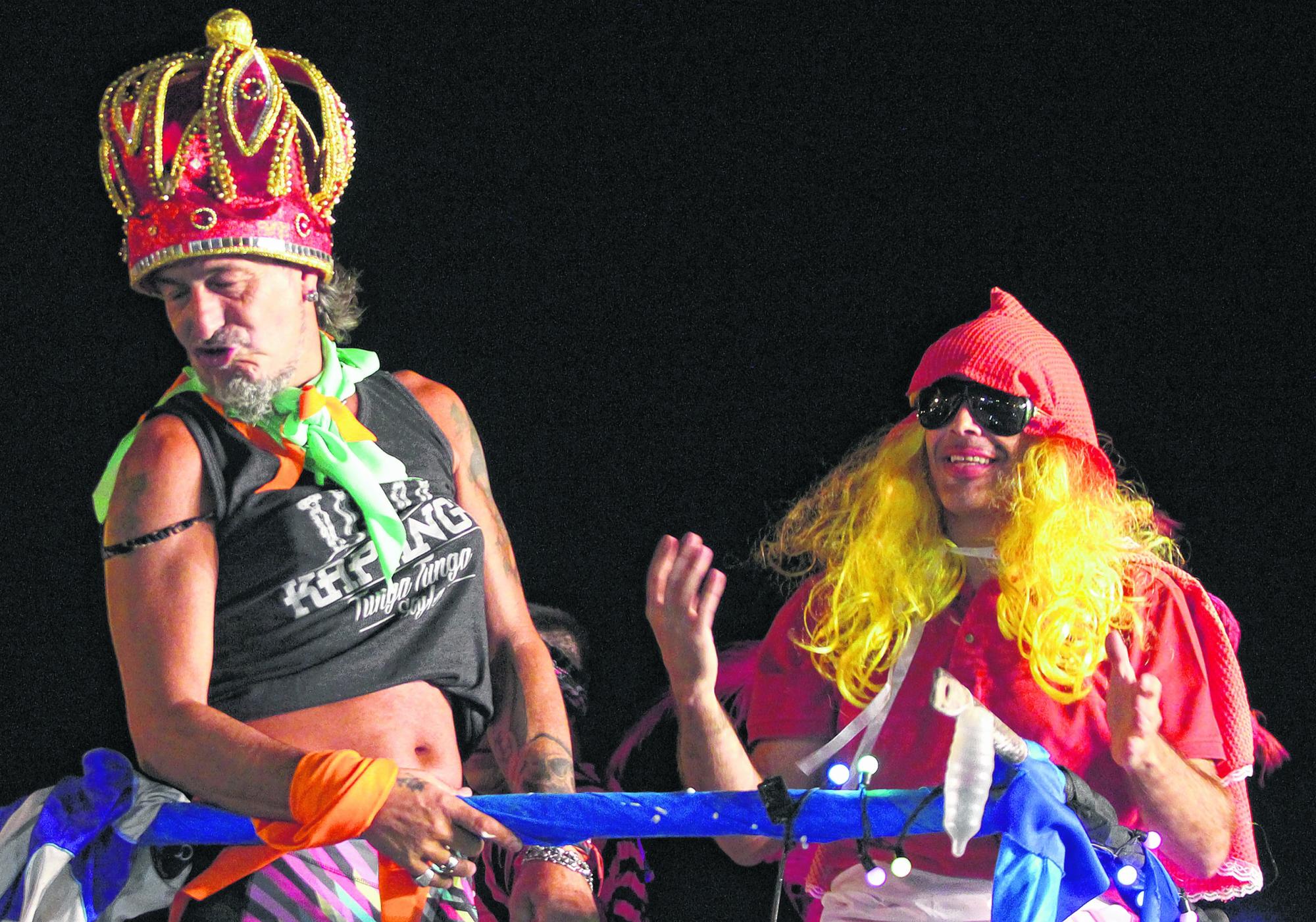 El “Mono” lució una remera corta y una calza que le prestó una bailarina, además de una fastuosa corona, mientras que el jefe comunal se vistió de Caperucita, o diablita roja, según las interpretaciones del público.