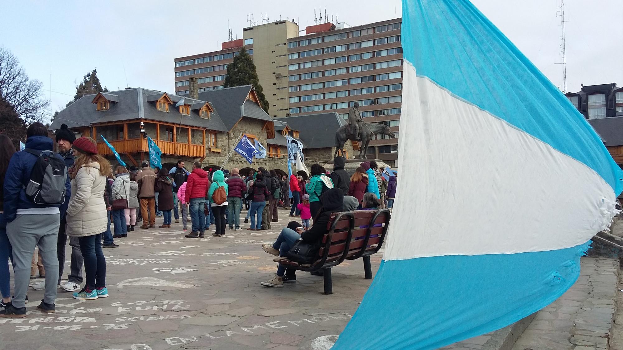 Con una enorme bandera argentina que rodeó gran parte de la plaza del Centro Cívico, con la leyenda “Patria sí, Colonia no”, organizaciones sociales, sindicales y políticas se manifestaron en Bariloche contra el acuerdo con el FMI y las políticas del gobierno de Mauricio Macri.