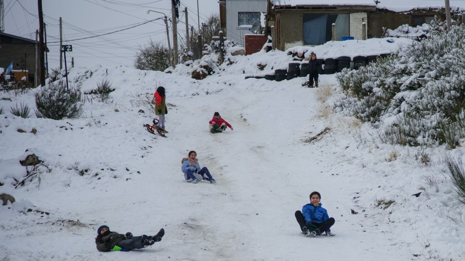 Niños y niñas de todas las edades salieron con lo que tenían a mano a deslizarse por cuanta pendiente tuvieran cerca de su casa. Algunos con barbijos un poco descolocados sobre sus rostros rosados por el frío, otros sin nada. No importaba. Vivieron una fiesta a su modo.
