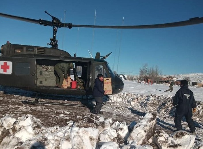 Con el objetivo de asistir a pobladores de la Región Sur afectados por la nevada, un helicóptero del Ejército Argentino y motos de nieve contratadas por el gobierno de Río Negro, trabajan en la zona en articulación, con la Secretaría de Protección Civil Provincial.