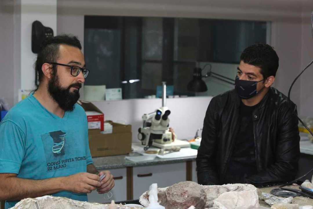 Los expertos Mauricio Serroni y Pablo Chafrat trabajan en la reconstrucción 3 D de los fósiles. Foto: Juan Thomes