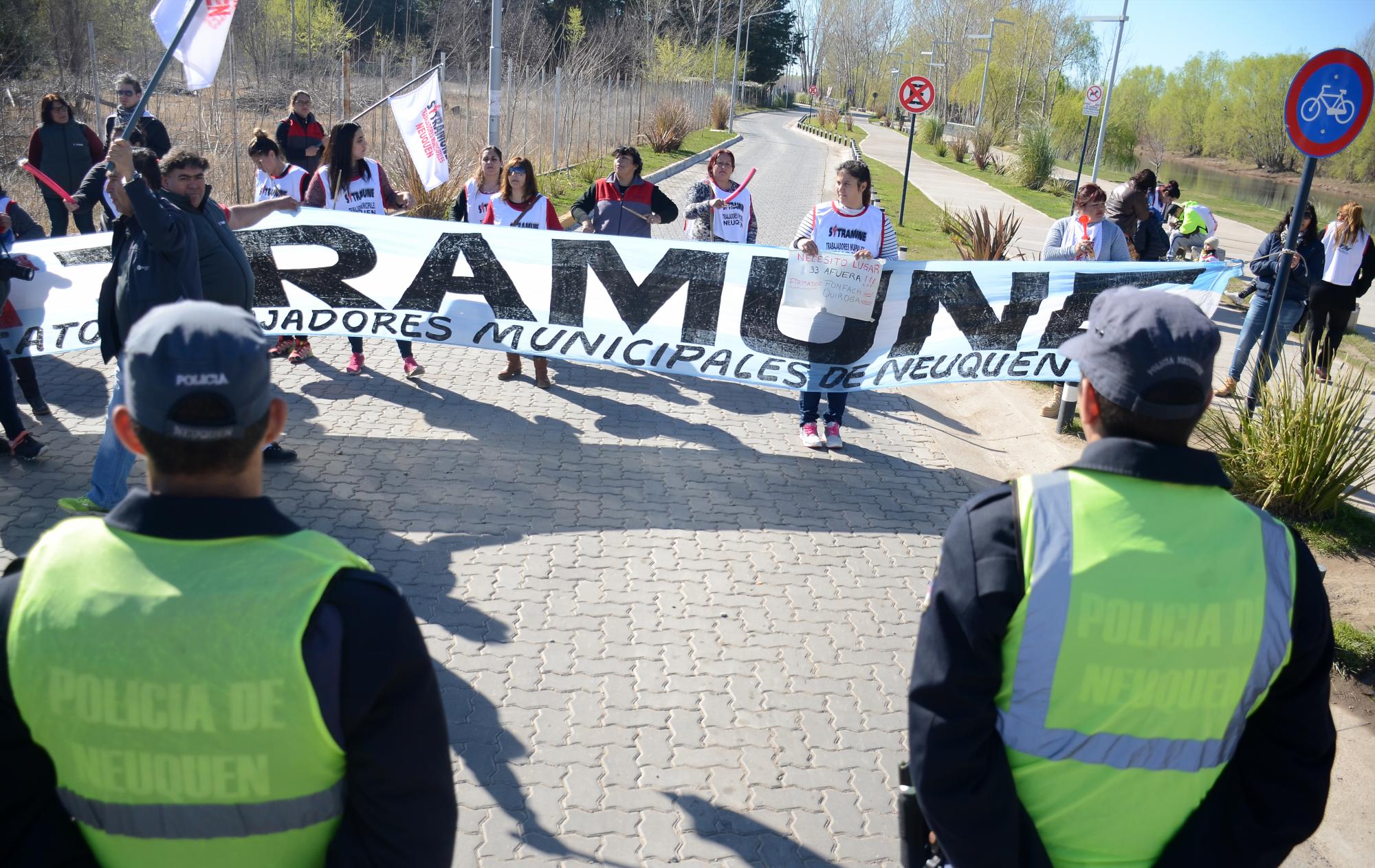 A la par de los festejos, el Sindicato de Trabajadores Municipales (Sitramune) trasladó su “ruidazo” del palacio municipal a la calle La Pampa, donde fueron custodiados por la policía.