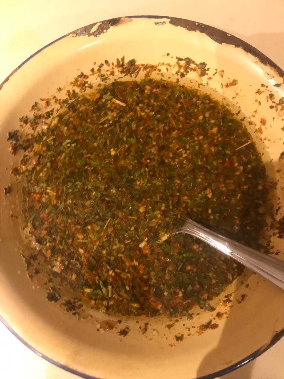 Procedimiento: hervir agua y agregar a las hierbas secas: esto hidratará y quedarán más blandas y soltarán su aroma , salar, incorporar aceite y vinagre.. dejar reposar todo lo que se pueda así concentra al