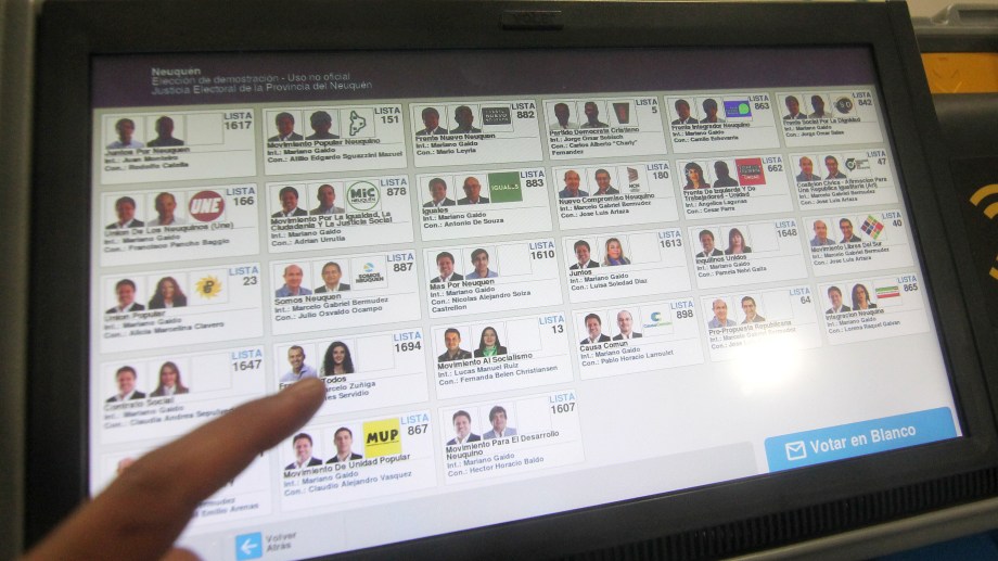 Con el diseño tal cual fue propuesto, la pantalla con la que se votará en los comicios presentará 27 casilleros entre los que la foto de Mariano Gaido, candidato a intendente del MPN, aparecerá 16 veces en representación de su partido y de las distintas listas colectoras que acompañan su postulación.