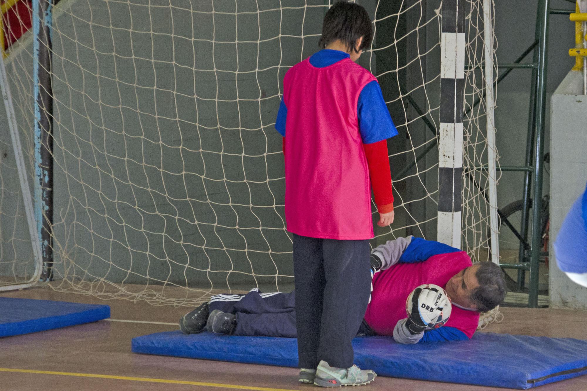 Comienza el partido, el equipo de camiseta roja y negra se enfrenta al cuadro azul. Debajo de los tres palos, se encuentra una persona mayor de pie custodiando el arco. Calzado con guantes de arquero en sus manos, y con su mirada fija a la pelota, que rueda en la mitad de la cancha, espera a que llegue su momento de actuar. Sobre sus costados hay dos colchonetas que esperan amortiguar su posible caída. “Es una persona disminuida visual y auditiva, y tiene un problema motor”, explicó Mendoza, quien agregó que “para agarrar la pelota se tiene que tirar. Entones ponemos la colchoneta para protección”.