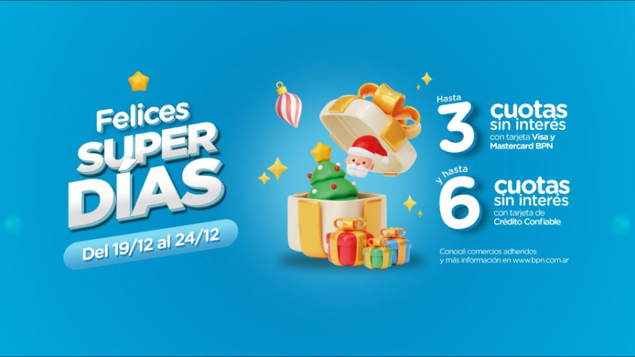 El Banco Provincia del Neuquén (BPN) tiene una nueva promoción para las fiestas de fin de año. Durante cinco días, los clientes que tengan tarjetas de la entidad podrán aprovechar los beneficios que ofrece “Super Días”, y abonar hasta en 6 cuotas sin interés en comercios de Neuquén y Río Negro. La promo se extiende desde el jueves 19 hasta el martes 24 de diciembre.