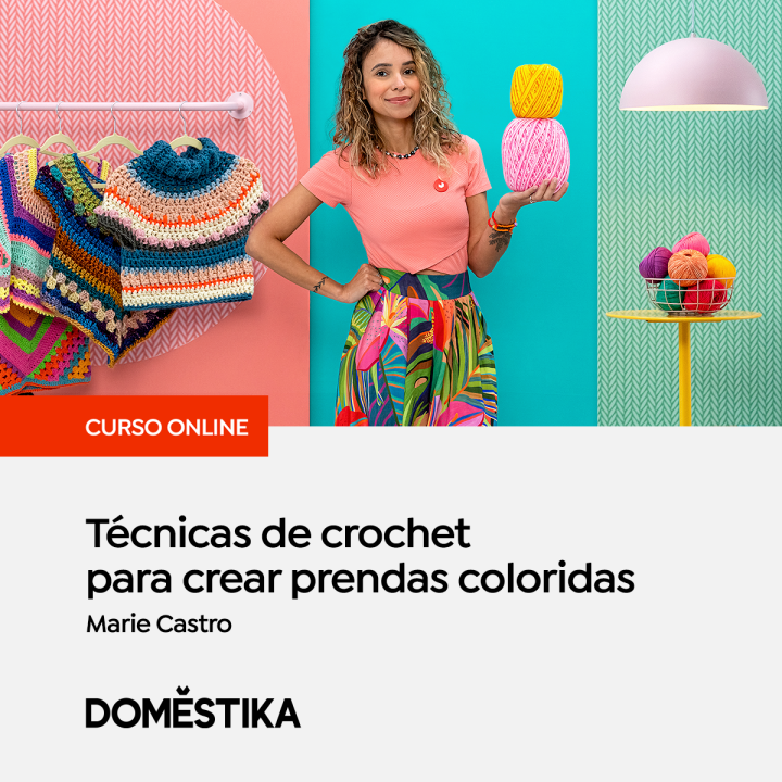 El curso «Técnicas de crochet para crear prendas coloridas» – disponible en la plataforma de Domestika – enseña a crear prendas desde cero, usando diferentes puntos e hilos de colores. Muestra técnicas que optimizan el proceso de confección y algunos trucos que te permitirán crear prendas con mucha personalidad.