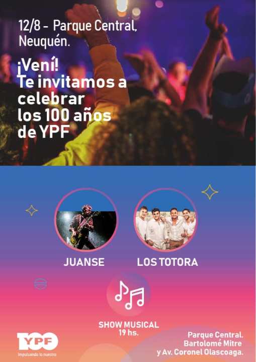 YPF festejará sus 100 años en Neuquén capital con un gran recital gratuito en el Parque Central, que contará con los shows de Juanse y Los Totora.