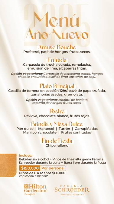 Con un valor de $190.000 por persona y $60.000 para niños de 6 a 12 años, la propuesta se presenta como una oportunidad para recibir el Año Nuevo de una manera inolvidable, disfrutando de una cocina de excelencia en un espacio elegante.