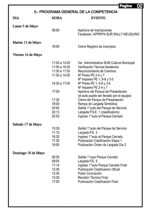 El viernes 16 habrá verificación administrativa y técnica desde las 11 de la mañana, reconocimiento de caminos y la esperada apertura del parque de presentación a las 17. A las 18 será la rampa simbólica, y desde las 20:13 comenzará el primer tramo clasificatorio (P.S.E. 1) que por primera vez en el año y en la historia de Añelo se va a correr en horario nocturno.