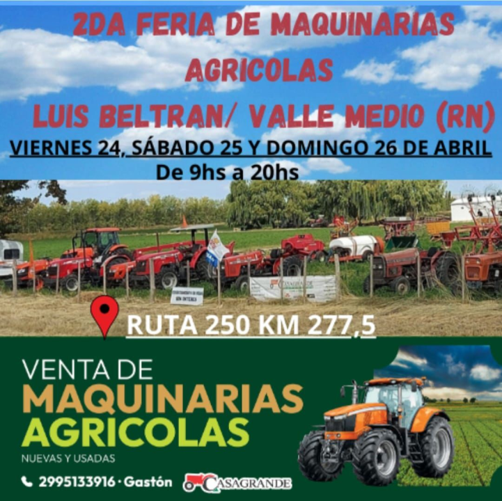 La 2° Feria de Maquinarias Agrícolas de Luis Beltrán se realizará los días viernes 24, sábado 25 y domingo 26 de abril, de 9 a 20, sobre la Ruta 250, km 277,5, y reunirá más de 60 equipos entre tractores e implementos agrícolas, en su mayoría provenientes del propio Valle Medio.