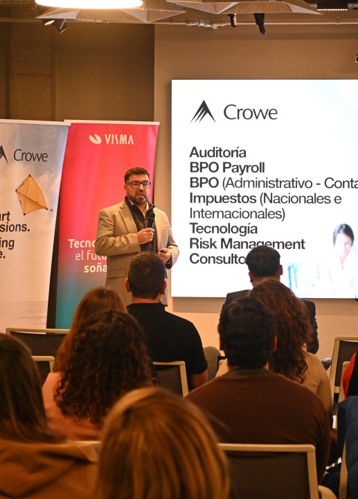 Durante la jornada, los asistentes conocieron los servicios y soluciones que ofrece Crowe, junto con el aporte de Visma, Bacci Contadores Públicos y We One. Dionisio Ferracutti, socio de Crowe, explicó que “el grupo ofrece una variedad de servicios, que van desde la consultoría tradicional hasta la implementación de tecnología, asesorando a las empresas para mejorar su gestión, automatizar procesos y transformar digitalmente su operación”.