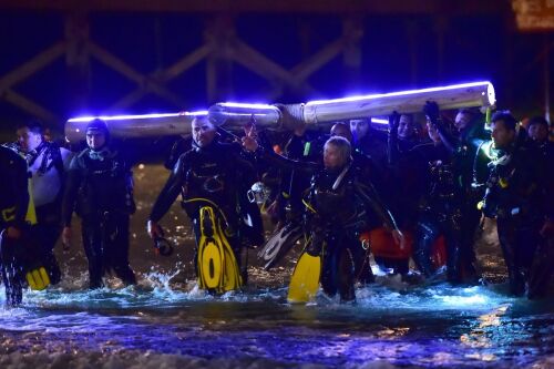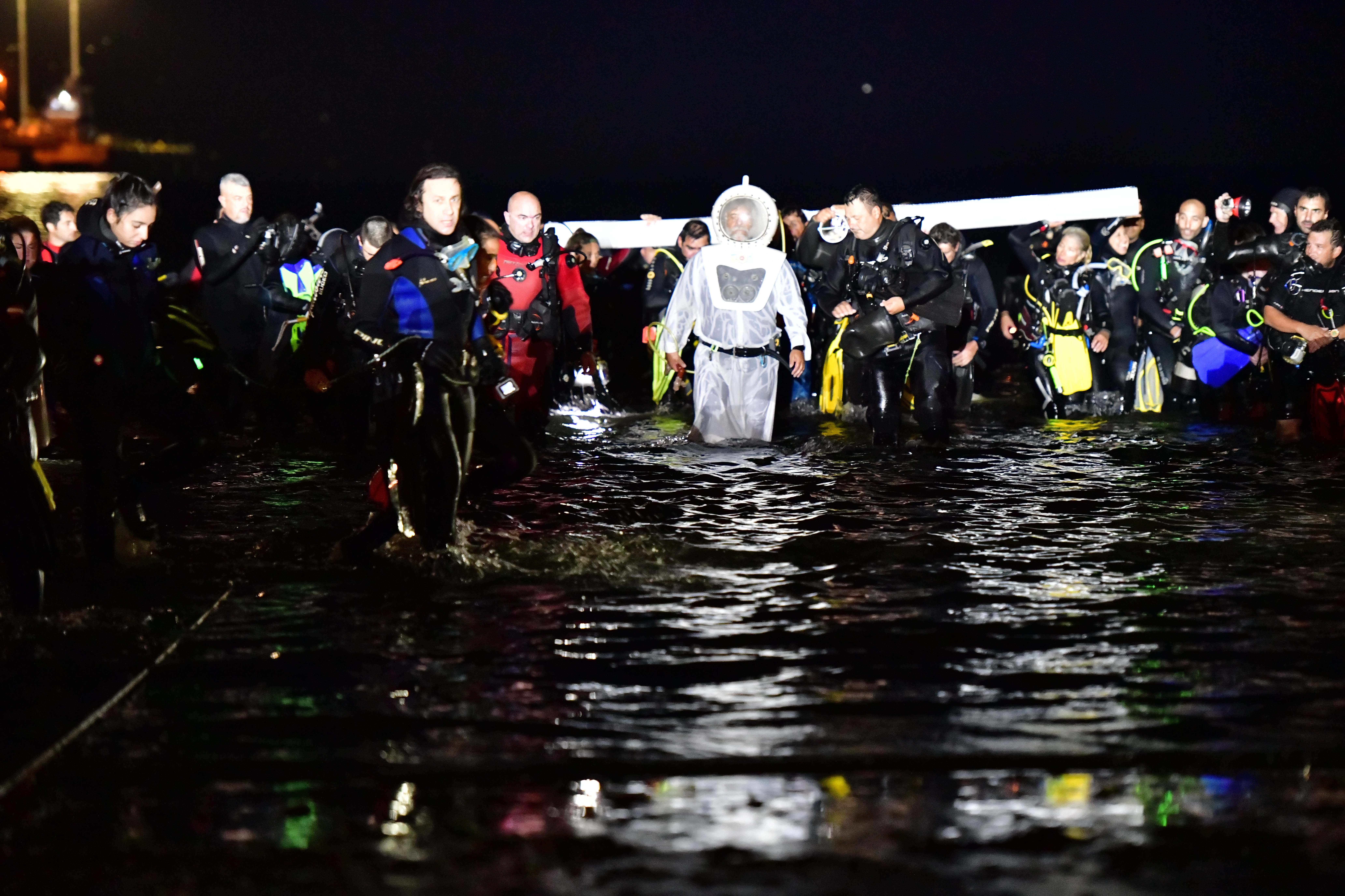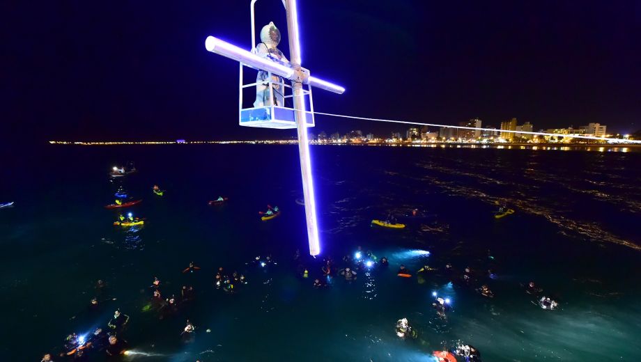 A medida que cae la tarde, el clima del evento adquiere una atmósfera particular: el público comienza a encender velas y, desde el mar, se proyecta el resplandor de la cruz iluminada, junto con las luces de los equipos que portan los buzos y las embarcaciones. La escena genera una postal única para quienes presencian el acontecimiento desde la costa o desde el muelle.
