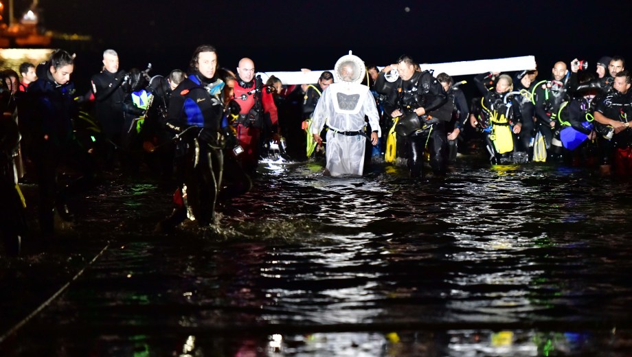 Entre quienes protagonizan este momento se encuentra, como cada año, “Pinino” Orri, reconocido buzo de la ciudad que desciende con su característica escafandra y acompaña el recorrido submarino de la cruz. A su alrededor se suman otros buzos, kayakistas y pequeñas embarcaciones que siguen el trayecto desde el agua, mientras cientos de personas observan desde el muelle y la costa.