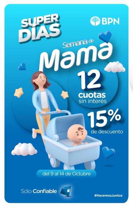 Desde el lunes 9 al sábado 14 va a estar vigente la promoción de BPN en la que vas a poder comprar los regalos para mamá en hasta 12 cuotas sin interés y con un descuento de hasta el 15%, sin tope de reintegro. Siempre con tu tarjeta de crédito Confiable.