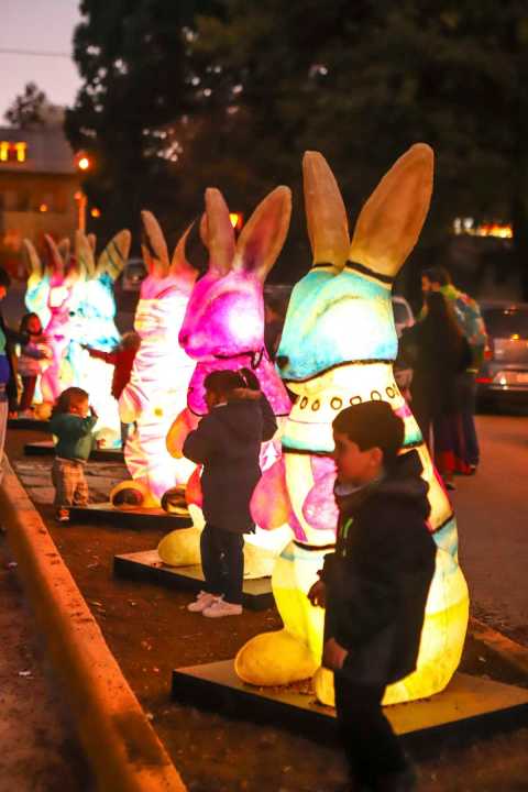 Calle Mitre y el Centro Cívico: arcos chocolatosos, huevos y conejos gigantes intervenidos artísticamente. Farolas. Habrá estaciones interactivas para sacarse fotos.
