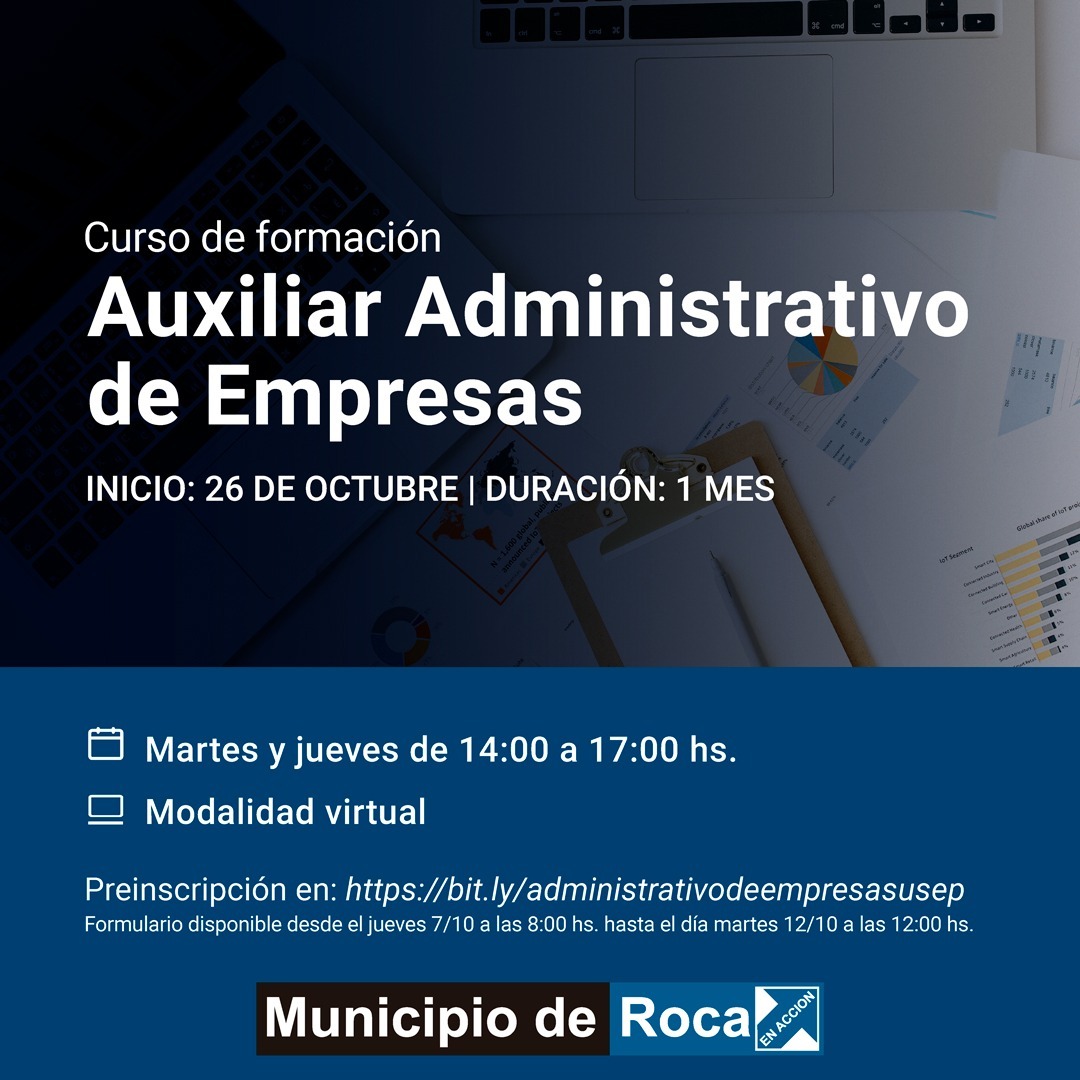 Este jueves 7 de octubre comenzará la preinscripción para el curso de Auxiliar Administrativo de Empresas organizado por la USEP municipal. Los y las interesados en la formación deben ingresar y completar el siguiente formulario: https://bit.ly/administrativodeempresasusep, el cual estará disponible desde este jueves a las 8 y hasta el martes 12 al mediodía.