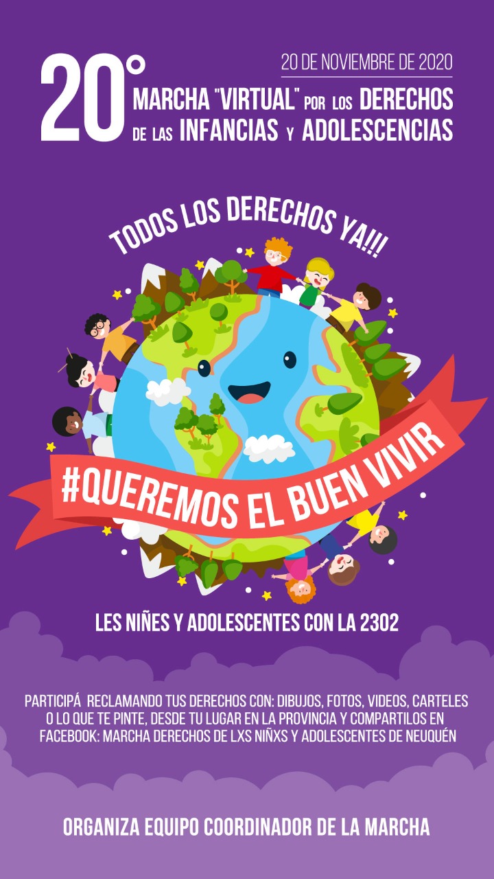 Se instó a los adultos a colaborar con las y los niños y adolescentes para que suban trabajos coloridos a la página de facebook con sus trabajos alusivos a los derechos de la niñez en la página https://www.facebook.com/marchaderechosdelxschicxsneuquen/ o en expresiones virtuales que lleven el hagstag #QueremosElBuenVivir a fin de que sean detectados y sumados a la pagina de la organización de la marcha.