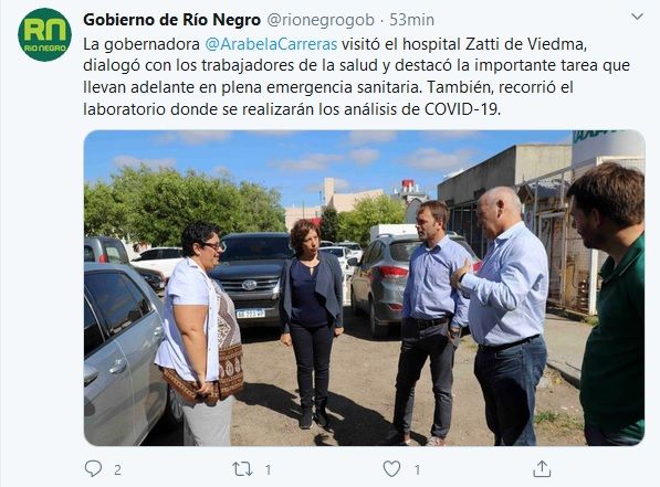 La gobernadora Arabela Carreras visitó el hospital Artémides Zatti de Viedma, donde recorrió el laboratorio donde dentro de poco se realizarán los análisis de Coronavirus COVID-19 y reconoció la labor de todos los trabajadores de la salud.