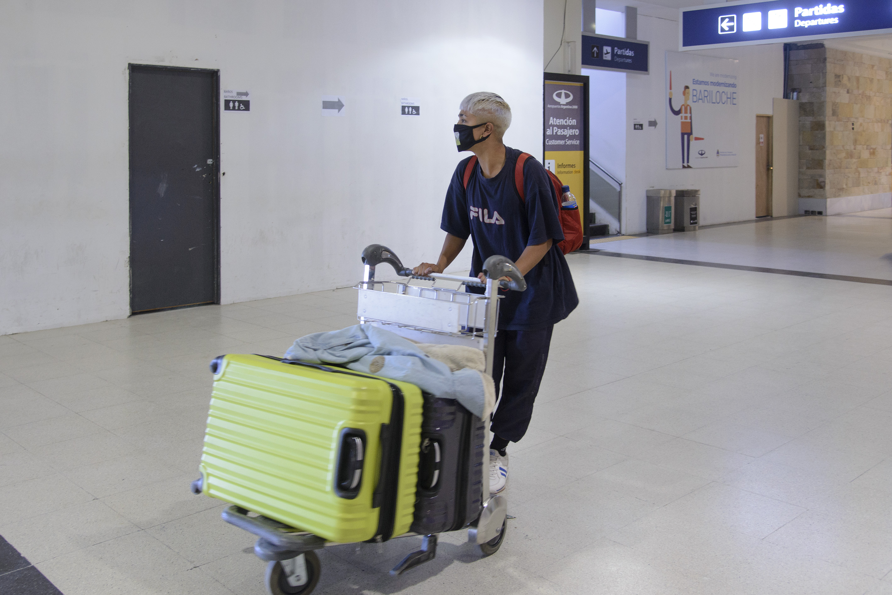 Un joven salió rápidamente del hall con un amigo. Tenía un pañuelo que le cubría casi todo el rostro. Explicó rápidamente que regresaba después de haber trabajado en Europa, pero que el cierre de la temporada se había precipitado.
