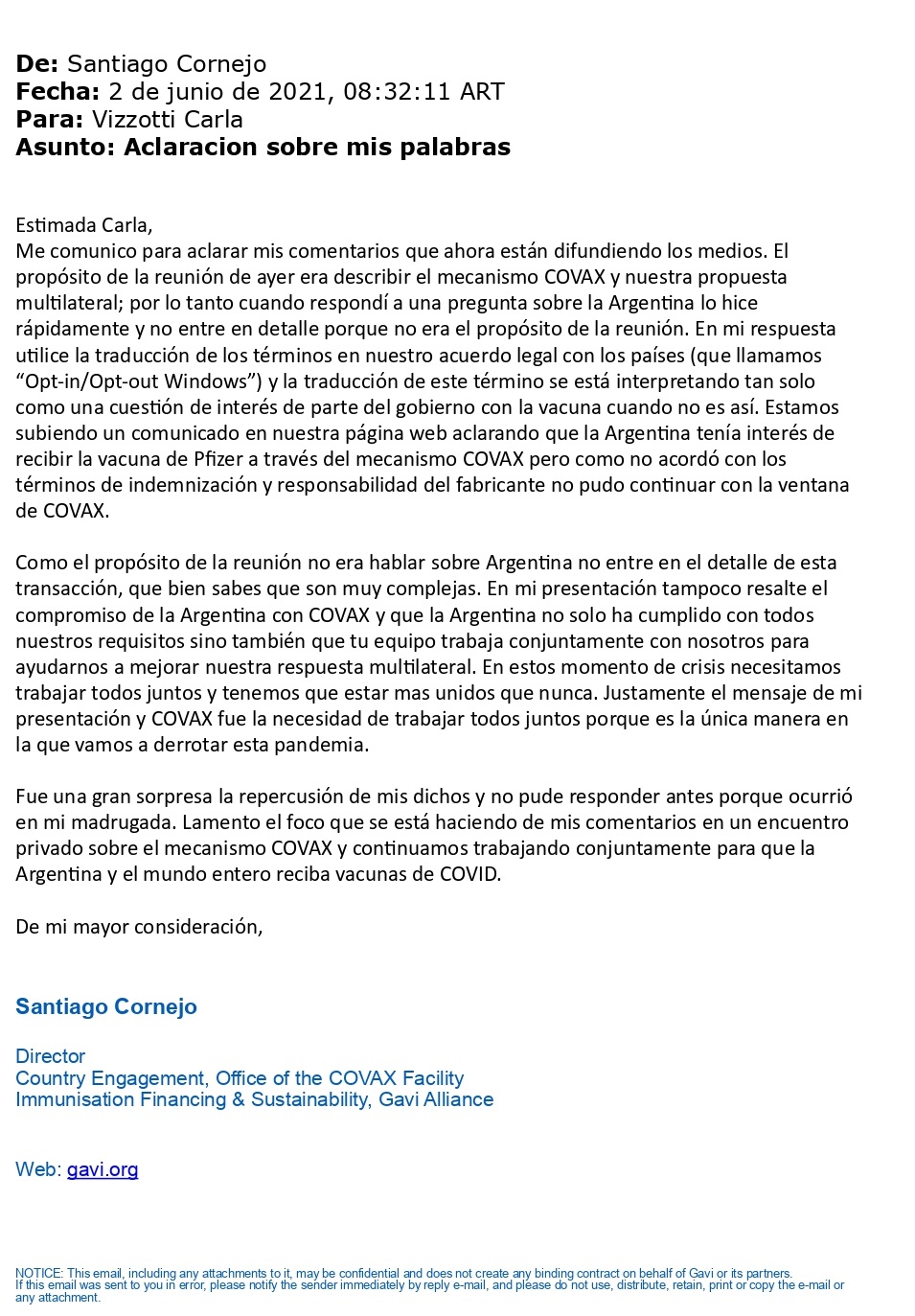 “Me comunico para aclarar mis comentarios que ahora están difundiendo los medios. El propósito de la reunión de ayer era describir el mecanismo Covax y nuestra propuesta multilateral; por lo tanto, cuando respondí a una pregunta sobre la Argentina, lo hice rápidamente y no entré en detalle porque no era el propósito de la reunión”, explica Cornejo en la carta enviada a Vizzotti, quien la hizo pública en la rueda de prensa que ofreció esta mañana en Casa de Gobierno.