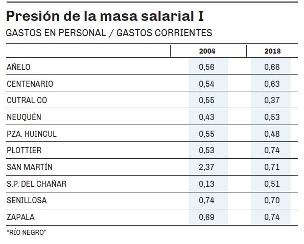 La masa salarial global de los municipios neuquinos cerrará este año en torno a los 10.000 millones de pesos. Tomada en forma aislada esta enorme cifra, no termina de mostrar la incidencia que tiene esta partida en el gasto global.
