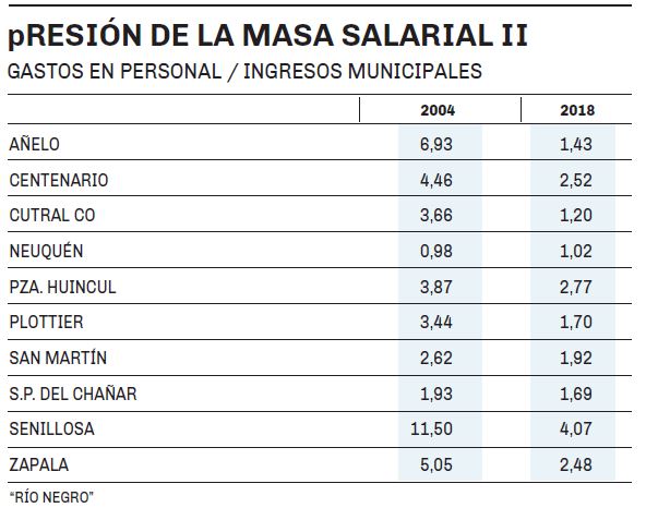 Senillosa necesita cuatro años de su recaudación propia para poder cancelar los salarios de un año. Viene de un indicador mucho peor: 11 años y medio necesitaba en 2004. Zapala, Plaza Huincul y Centenario están en el lote de intendencias que más que duplican los años para cancelar salarios.