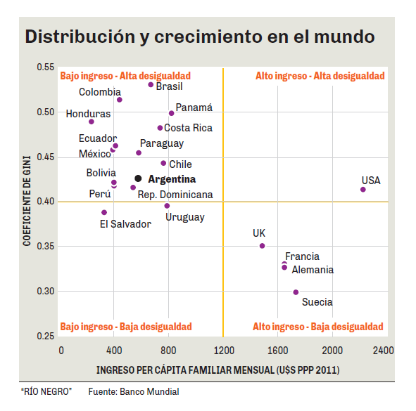 En los gráficos que acompañan la nota puede apreciarse a los distintos países colocados en base al ingreso per cápita familiar con paridad de poder de compra de 2011 y al registro de Coeficiente de Gini como medida de distribución del ingreso. En el cuadrante superior izquierdo se ubican los países de bajos ingresos y alta desigualdad, en el cuadrante inferior izquierdo los de bajos ingresos y baja desigualdad, en el superior derecho los de altos ingresos y alta desigualdad, y en el inferior derecho los del altos ingresos y baja desigualdad. Este último sería el lugar deseable en que el crecimiento del producto per cápita signifique además una distribución más equitativa.