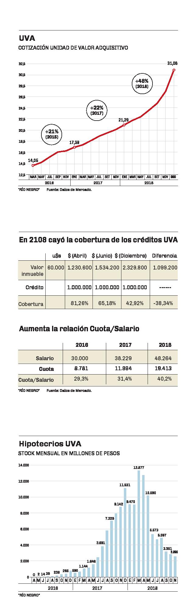 El primero tiene que ver con la relación Cuota/Salario. Al inicio del programa en abril de 2016, una persona con ingresos por $30.000 mensuales, podía acceder a un crédito de $1.000.000 a una tasa que oscilaba entre el 3,5 y el 6,5%, afrontando una cuota mensual de 625 UVAs, que equivalían a $8.781. Con esos parámetros, la relación Cuota/Salario era del 29,3%. Sin embargo durante 2017 y 2018, el valor de la UVA acumuló un incremento del 78,71% (ver infograma), mientras que según el Indice de Salarios del Indec, los haberes subieron un 60,88%. Así las cosas, la persona que solicitó el millón de pesos en 2016 pagando 625 UVAs, tenía a fines de 2018 un salario de $48.264 y pagaba una cuota de $19.413. La relación Cuota/Salario saltó al 40,2%. He aquí el primer problema: el golpe que recibió el salario real el año pasado hace que la incidencia de las cuotas sea cada vez más pesada para el bolsillo. El gobierno estableció que los tomadores de crédito UVA están habilitados para solicitar la extensión de los plazos por única vez si el incremento anual de la UVA supera en 10% el aumento anual de sus haberes. Luce insuficiente al ser una bala de plata que puede utilizarse por única vez, frente a una inflación que parece lejos de ceder. Otro de los ‘éxitos’ que pregonaban los impulsores de las UVA hace dos años, era que los beneficiarios pagaban una cuota sensiblemente menor al precio de un alquiler. El golpe inflacionario fue tal en 2018, que por primera vez desde el inicio del sistema, las cuotas de los préstamos crecieron más que el precio de los alquileres, y el valor actual de las cuotas es muy similar al de un alquiler.