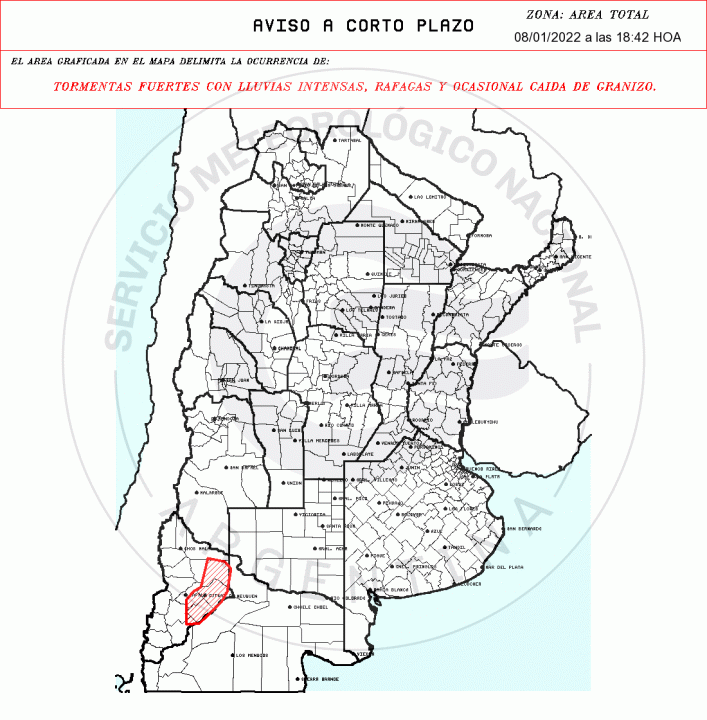 Por su parte, el Servicio Meteorológico Nacional (SMN) emitió un aviso a muy corto plazo por tormentas fuertes con lluvias intensas, ráfagas y ocasional caída de granizo en la provincia de Neuquén. El área de alcance de la tormenta abarca la localidad de Añelo, los departamentos Catan Lil, Collon Cura y Confluencia, y las ciudades de Pircún Leufú y Zapala.