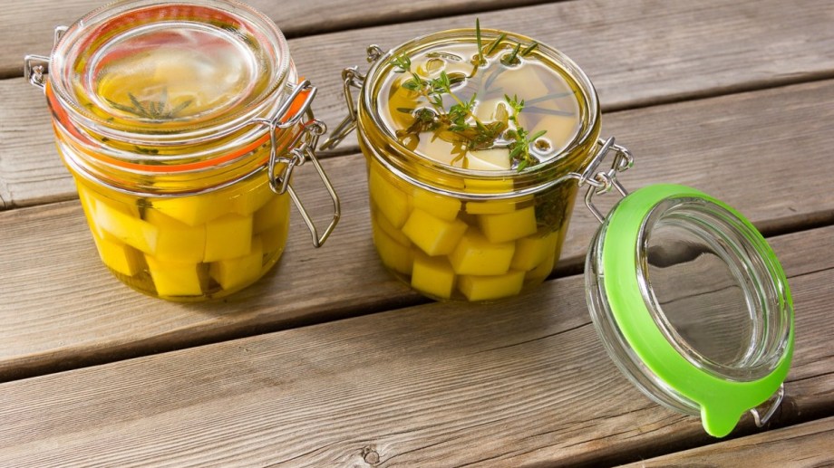 Cortar el queso en cubos. Colocarlos en un frasco esterilizado y cubrirlos con el aguardiente. Tapar y dejar macerar durante 2 horas. Retirar el agaurdiente del envase y agregar las hierbas junto con los granos de pimienta y los dientes de ajo. Cubrir la preparación con aceite de oliva a 80°. Tapar y guardar en la heladera. Dejar estacionar durante 15 días antes de consumir.