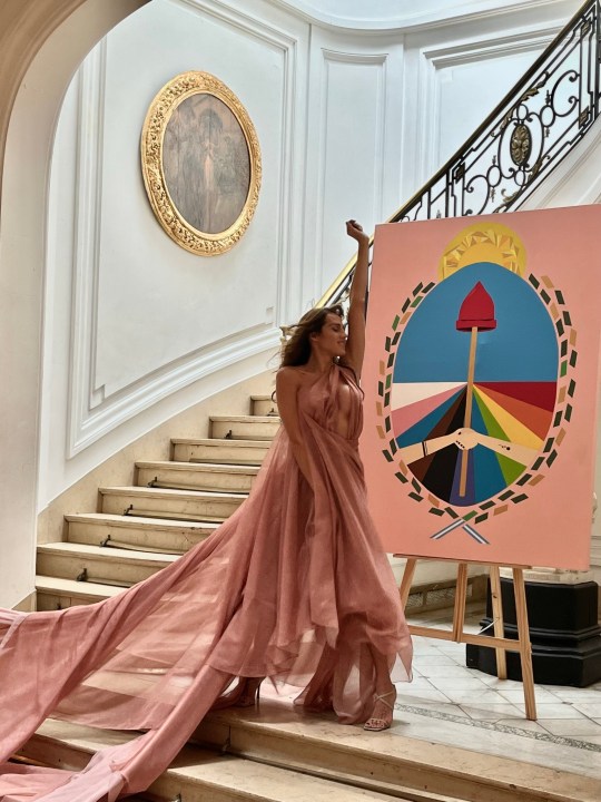 “Hagamos de cuenta que hacemos una campaña presidencial en la que la candidata sos vos”, le propuso Albisu a Genesio. “Y yo empiezo a intervenir banderas, a transformar en diversas las banderas de distintos países. Ahí nos metimos con los símbolos nacionales, intervenimos la bandera de Estados Unidos, de Rusia, de China, de Francia, la de Argentina, el escudo nacional, que lo transformamos en diverso, la escarapela nacional, diversa y el himno nacional. Tomamos todo lo simbólico y justamente lo transformamos, y no solamente con la idea de abrazar lo que es la comunidad LGBTQ, sino dando un abrazo más amplio a todas las minorías y diversidades en su más amplio concepto que tienen luchas más duras o peleas no sé si más grandes, quizás a veces son más minúsculas porque son desde lugares que no son visibilizados, pero la obra también ayuda a acompañar desde ese lugar”.