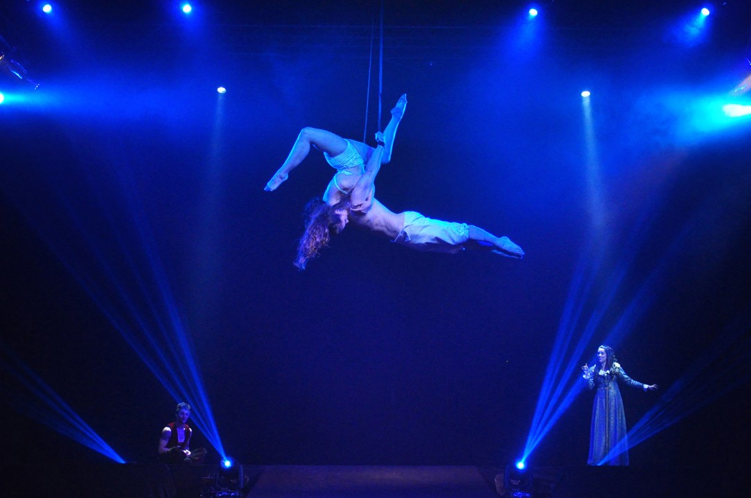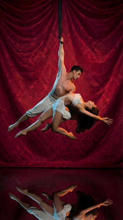 Telas: en una exhibición de tolerancia y fuerza, estos artistas se hacen un solo ser con las telas que los acunan. Esta danza aérea requiere de habilidad y flexibilidad.