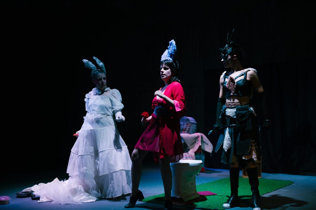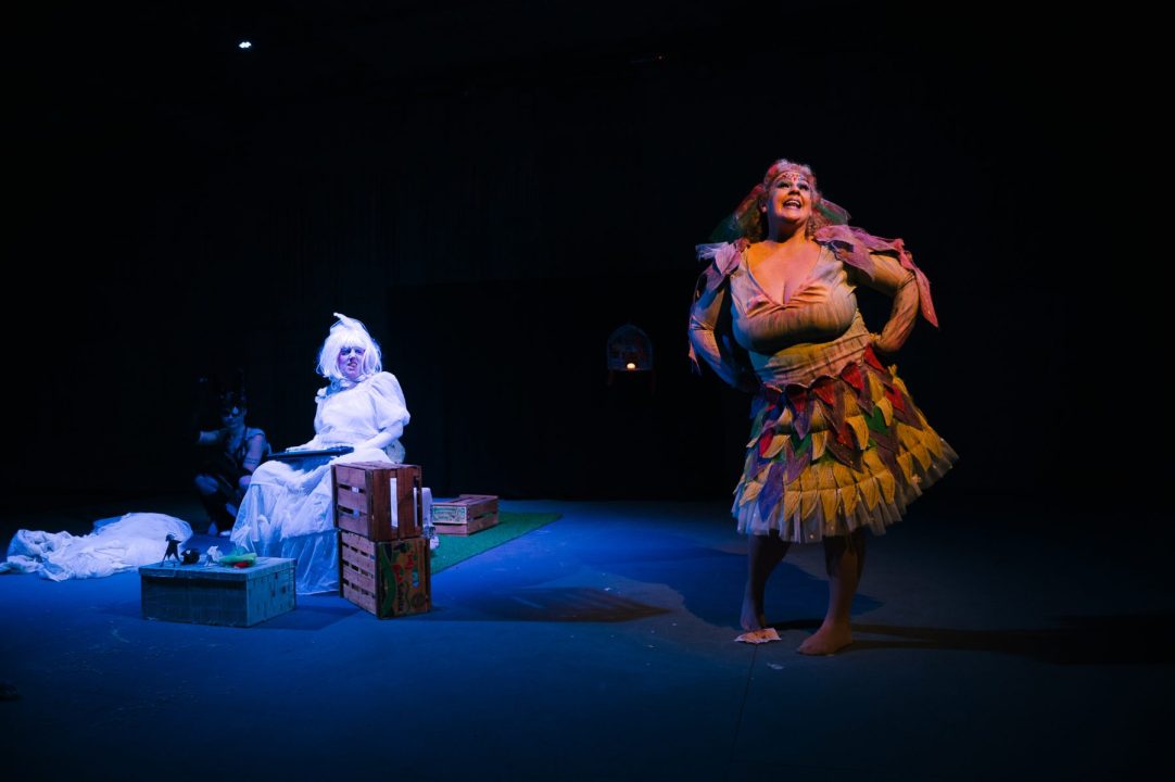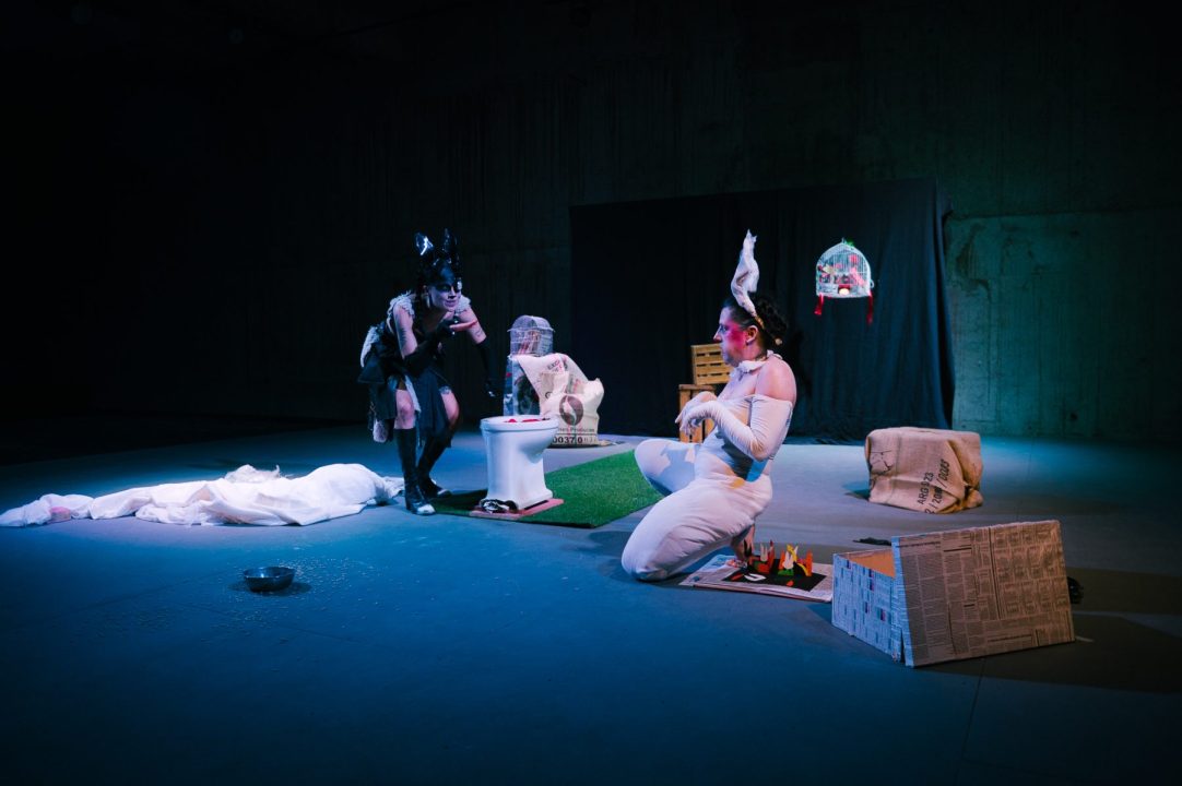 R: Lo resolvimos a partir de hacernos muchas preguntas, porque también algo de trabajar en este mundo absurdo, animalesco, que somos humanas animalizadas, somos animales completamente y en cómo generar esa sensación nos llevó un poco a pensar en el vestuario. La vestuarista se acercó a los ensayos y nos trajo una propuesta haciéndonos justamente estas preguntas. Entonces hay algo que aparece en los vestuarios de estas orejas de conejas y algo del cuerpo mullido, en el caso de la coneja blanca, o lo colorido de la pajarona. Y después un poco la puesta empieza a surgir en relación con encontrar un espacio que dé esa sensación de encierro, arrumbado y a medida que íbamos ensayando e iban apareciendo algunos elementos que nos convocaban a pensar en esa puesta.