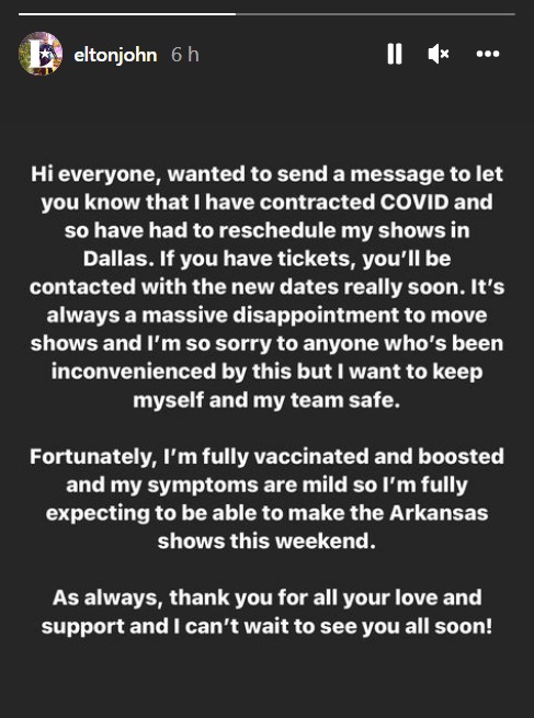 Elton John contrajo Covid y por ello decidió aplazar dos conciertos en Dallas, Estados Unidos, que forman parte de la gira de despedida antes de su retiro de los escenarios.