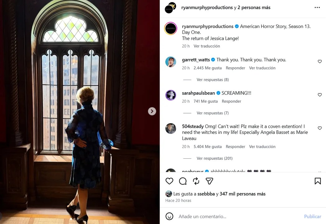 “American Horror Story, temporada 13. Día Uno. ¡El regreso de Jessica Lange!”, anunció el productor en su cuenta de Instagram. La publicación reúne un total de 347 mil me gustas.
