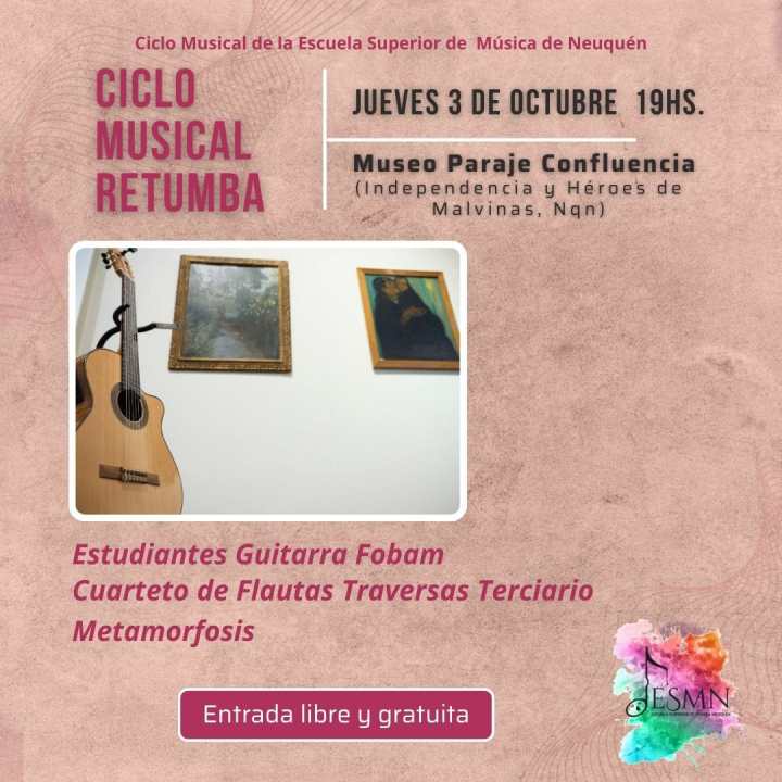 La escuela superior de música de Neuquén inicia este jueves el ciclo musical «Retumba», donde se presentarán distintas propuestas musicales de la institución. Será a las en el Museo Paraje Confluencia a las 19. El domingo es la segunda fecha.