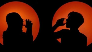 Con una estética visual muy propio de su universo gráfico, el Indio Solari y Pedro Rosemblat habitaron cada uno de ellos un círculo anaranjado. A contraluz de un sol que solo dejó ver sus inconfundibles perfiles negros.