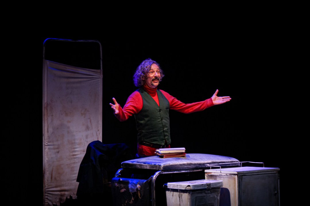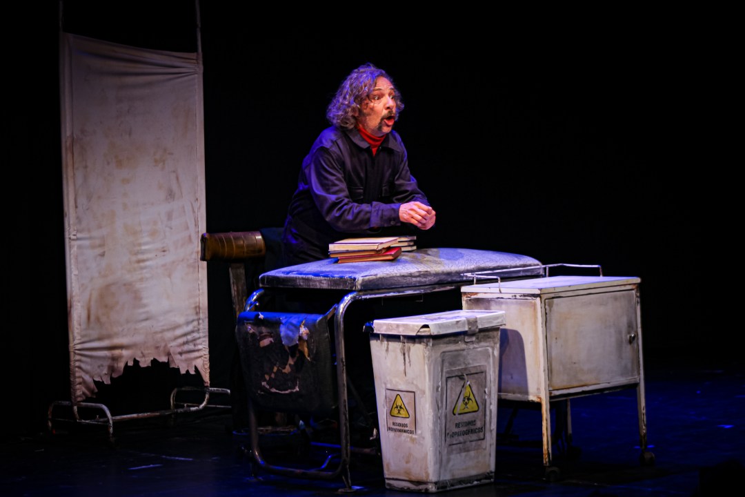 “Si entrás en un depósito de la facultad de medicina y hay una tela blanca sucia que tapa todo lo que hay adentro, los materiales, las camillas hechas pelota, bueno, a partir de ahí el tipo entra con una linterna y empieza a ver cómo va a dar la clase, qué va a usar de todo eso para dar esa clase, dando la idea que tal vez a la clase la dé en una ferretería y la hace con tornillos y con una llave, por ejemplo. Lo cierto es que a partir de ahí empiezan a salir los elementos. Un esqueleto hecho pelota, una camilla un tacho de basura, une escritorio… Esos mismos elementos escenográficos se van transformando durante el recorrido de la obra”.