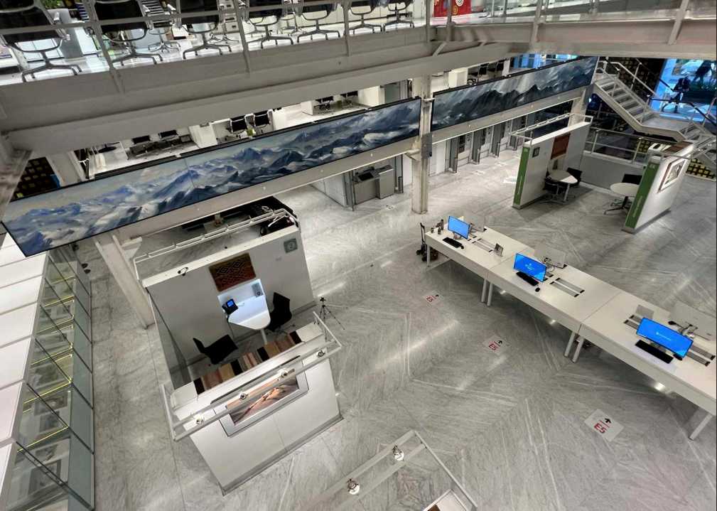 El tamaño de la obra principal (Mahuida) es de 18 x 1metros. Tuvimos que adaptarla al lugar así que se le restó finalmente un metro. Son 6 bastidores de 3×1 que juntos forman un pedacito de la cordillera andino patagónica. El tamaño puede sonar enorme y fue todo un desafío pintarlo pero no es nada a comparación de nuestra gigante Patagonia y cordillera, obviamente.