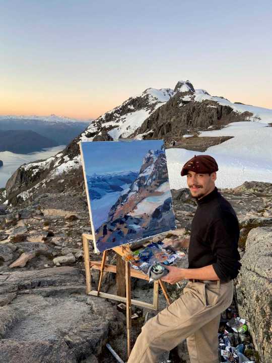 En el mientras tanto, él lo pinta, ahí parado donde sea -en una pendiente, en una cumbre- en esta Patagonia infinita.